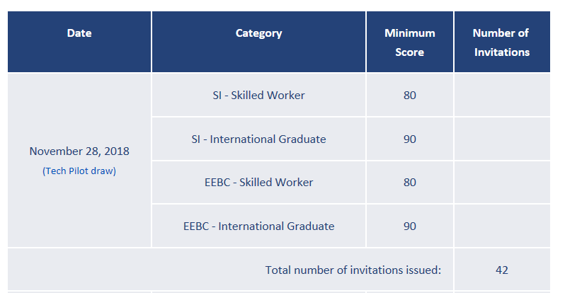 美加金联从加拿大BC省移民局获悉:2018年11月28日BC省省提名科技人才试验项目(Tech Pilot)类别的技术工人类别(SI-Skilled Worker)筛选分数80分;国际留学生类别(SI-International Graduate)筛选分数90分;快速通道技术工人类别(EEBC-Skilled Worker)筛选分数80分;快速通道国际留学生类别(EEBC-International Graduate)筛选分数90分,本轮筛选共计发出42份邀请。