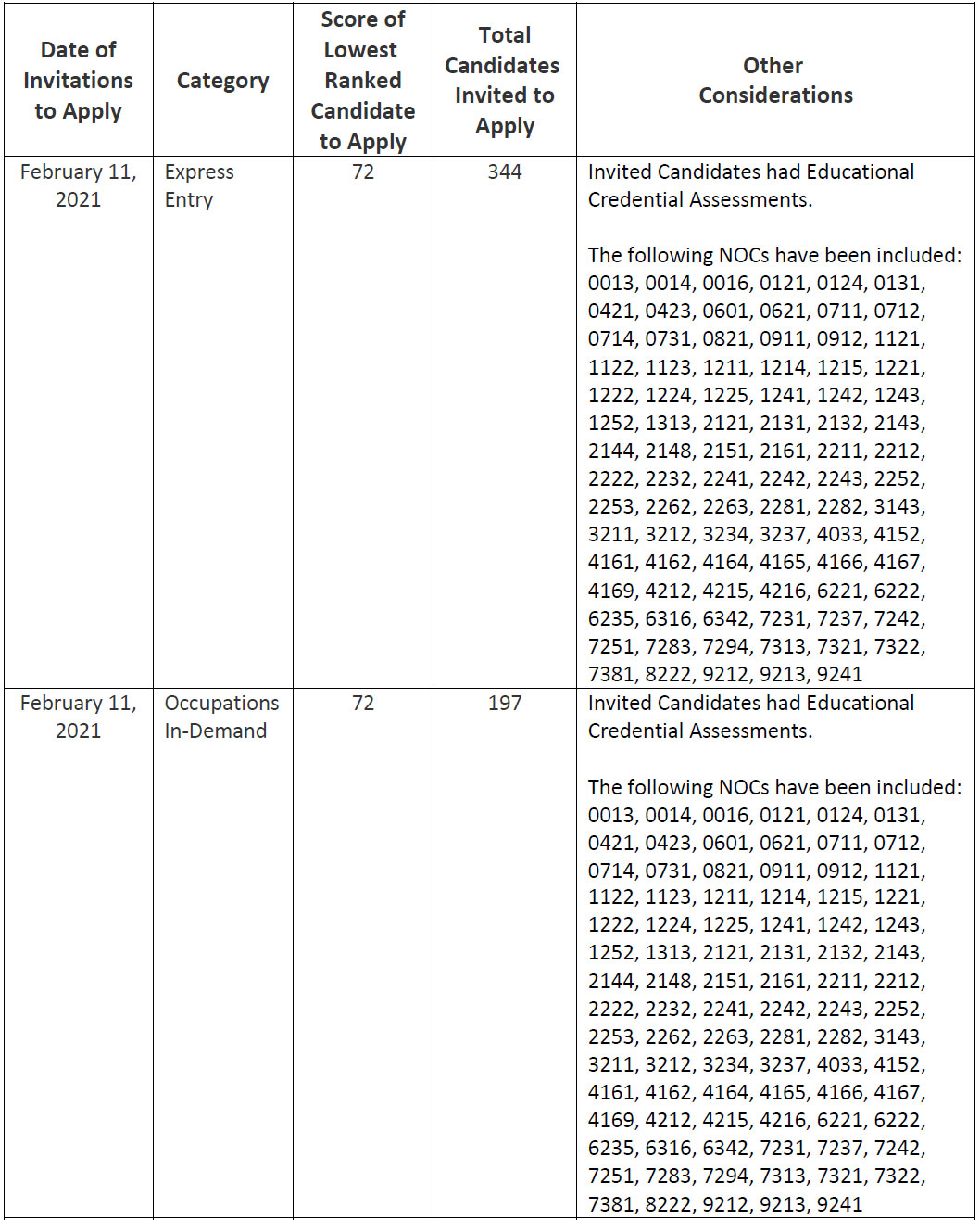 美加金联从加拿大萨省移民部获悉:2021年2月11日萨省技术移民快速通道(Express Entry,简称EE)类别筛选分数72分,发出344份邀请;需求职业(Occupation-in-Demand,简称OID)类别筛选分数72分,发出197份邀请。本轮筛选共计发出541份邀请。