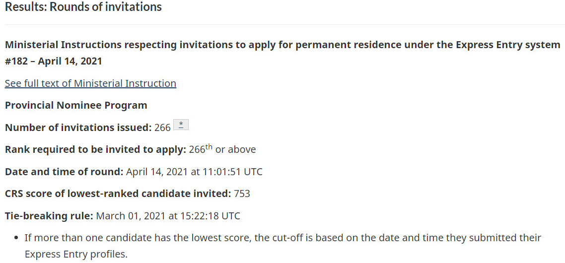 美加金联从加拿大移民部获悉:2021年4月14日加拿大联邦技术移民Express Entry快速通道项目筛选分数为:省提名753分,发出266份邀请。