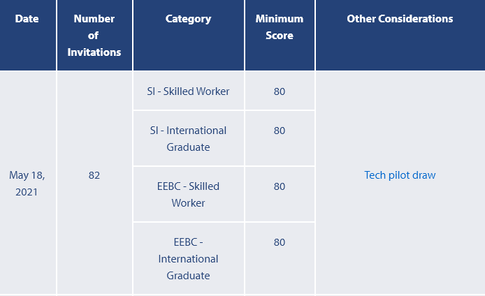 美加金联从加拿大BC省移民部获悉:2021年5月18日BC省移民部公布技术移民筛选分数:技术工人类别(SI-Skilled Worker)筛选分数80分,国际留学生类别(SI-International Graduate)筛选分数80分,快速通道技术工人类别(EEBC-Skilled Worker)筛选分数80分,快速通道国际留学生类别(EEBC-International Graduate)筛选分数80分,本轮筛选共计发出82份邀请。