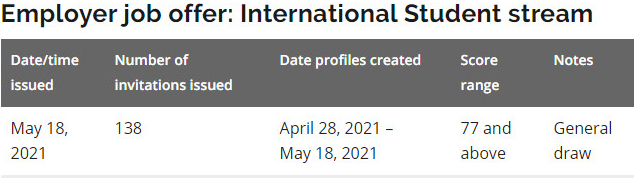 美加金联从加拿大安省移民局获悉:2021年5月18日,安省省提名国际留学生类(Employer job offer: International Student stream)首次筛选,筛选分数77分,发出138份邀请。
