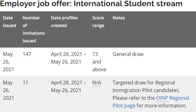 美加金联从加拿大安省移民局获悉:2021年5月26日,安省省提名国际留学生类(Employer job offer: International Student stream)筛选分数出台: