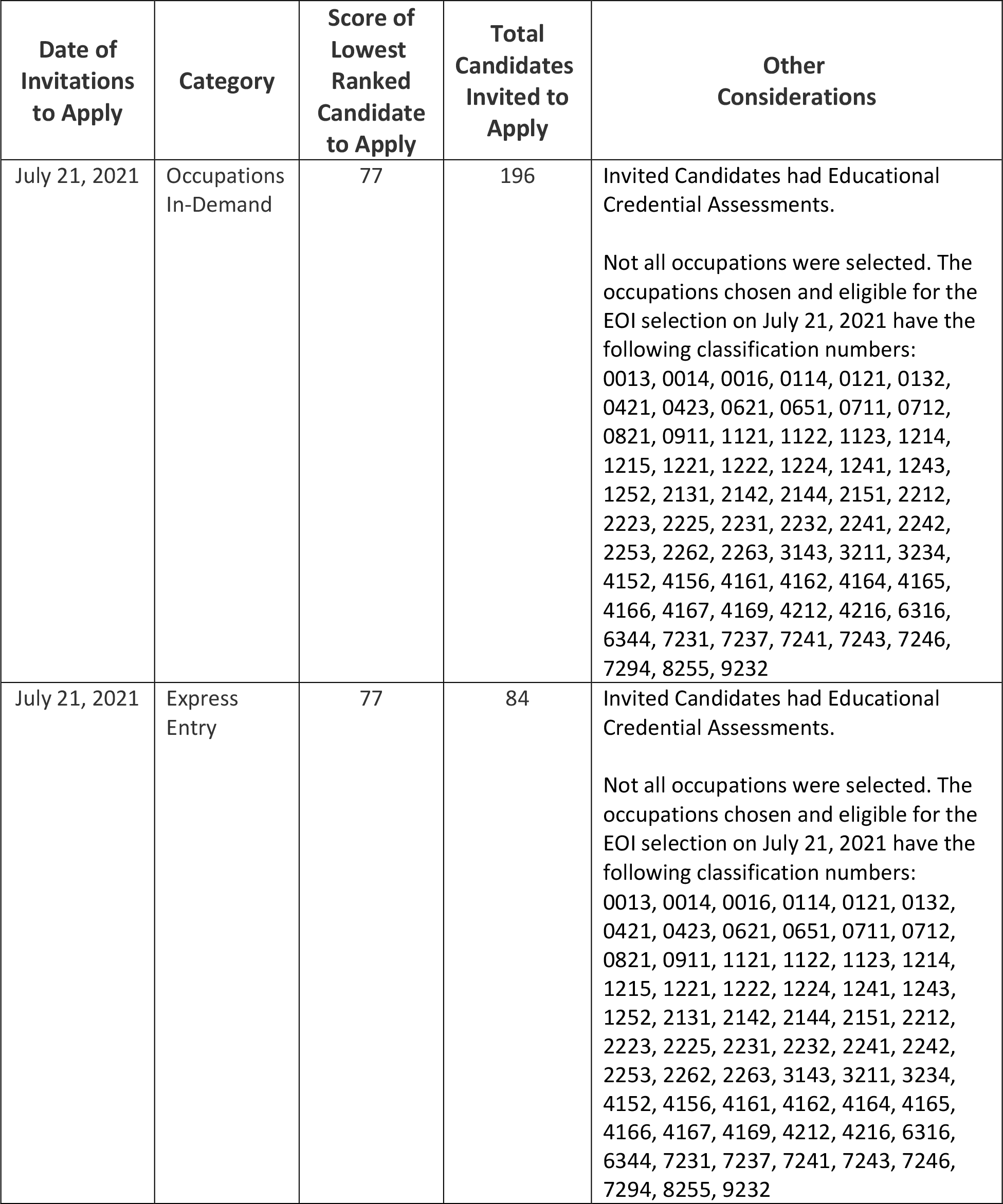 美加金联从加拿大萨省移民局获悉:2021年7月21日萨省技术移民快速通道(Express Entry,简称EE)类别筛选分数77分,发出84份邀请;需求职业(Occupation-in-Demand,简称OID)类别筛选分数77分,发出196份邀请。本轮筛选共计发出280份邀请。