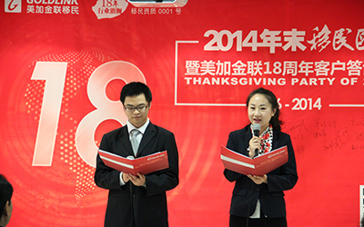 答谢会伊始,美加金联公司创办人Ms.Helen登场致辞,为到场嘉宾带来新年祝福,Helen女士指出:2014年,是整个移民行业非常动荡的一年,传统移民国家如加拿大,投资移民关门一刀切,到魁北克投资移民重新开门;美国EB-5投资移民项目鱼目混杂;欧洲各国纷纷打开国门开放移民政策。每一个国家新政出台,美加金联都会在尽可能快的时间获得,并尽可能快的时间赴实地考察。在千变万化的市场大潮前,美加金联彰显出了强大的实力和高超的专业水平,前瞻性的眼光和独到的市场洞察力,使我们在面对瞬息万变的移民政策时,做到了提前预知、提前分析、提前应对,成功地开辟了2014年移民项目多样化的新格局,并取得了骄人的成绩,为给客户提供更高品质的服务打下了更坚实的基础。随后,为客户详细的介绍了多重国籍和第三国护照的使用方式,以及分享规避移民监的秘籍。精彩的演讲让每一位到场嘉宾都受益匪浅。紧接着,为在场的所有客户推出了安提瓜和巴布达投资入籍项目,对该项目做出简介,并分析该项目的优势所在。