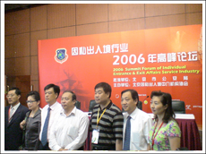 2006年9月15至17日 “因私出入境行业2006年高峰论坛” 在北京举行。此次论坛遵循专业、务实的原则,围绕“规范、合作、展望”的主题展开广泛研讨。论坛还邀请了政府相关部门领导、中国公民因私出入境主要目的地国家的出入境管理机构和驻华使领馆官员、国内因私出入境行业组织和成员单位、国外同行业协会和组织成员及各大媒体。