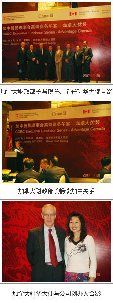 加拿大财政部长Mr. Jim Flaherty 2007年01月19日在北京会见了加拿大与中国的金融及贸易领军人物,希望藉此增强加中两国的经济合作关系。 创办人Ms. Helen0n被邀请与Mr. Jim共进午餐,席间,加拿大财政部长Mr. Jim、加拿大驻华大使Mr. Robert G. Wright分别与Ms. Helen进行了合影并作了亲切的交谈。