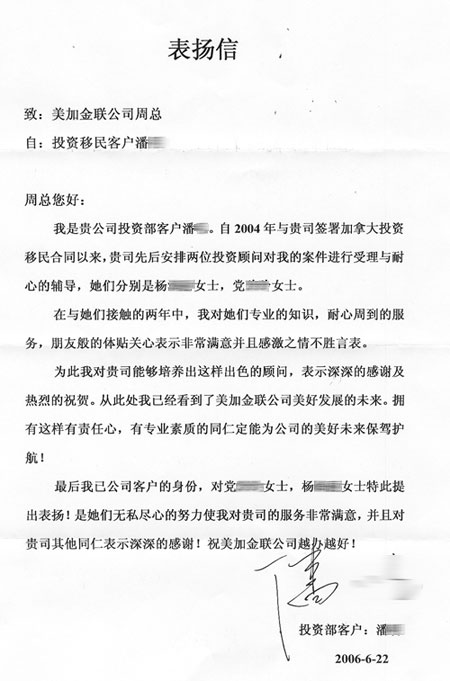 潘先生在公司的帮助下成功申请加拿大投资移民,出于对公司专业服务的感谢,潘先生特地写了表扬信并定制了三座奖杯分别颁发给公司和为他的申请提供专业服务的杨小姐和党小姐。