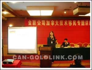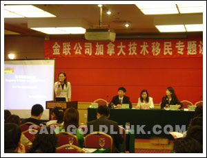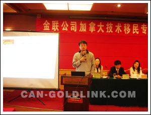 在大家渴望的目光中,座谈会正式开始了。首先,金联公司副总经理Mr.Johnny就2006年技术移民新态势、成功申请加拿大技术移民的关键要素、分数不够的申请者该如何应对等众多嘉宾关心的问题作了深入剖析。他演讲的内容切中要害,把相关问题的实质性内容展现给了与会者。专业、诚信、始终是金联人秉持的原则,也正是金联公司获得业界口碑良好的原因。