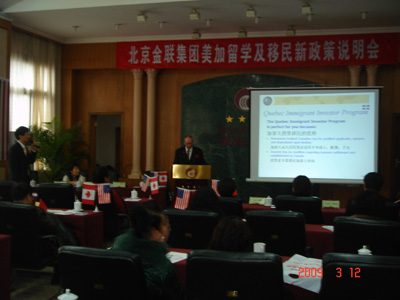 本月10日至14日美加金联公司创办人Ms.Helen携金联公司部分领导及公司顾问们来到四川,展开为期一周的09年移民新政策相关讲座。讲座详细讲解了魁北克投资移民新政策,介绍了加拿大房地产及相关生活讯息,并以独到视角分析了投资移民相对于留学的诸多优势。