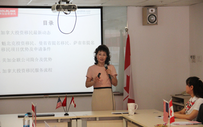 2015年05月09日下午2时,由美加金联公司举办的加拿大投资移民专场说明会,在美加金联会议厅成功举行。美加金联创办人、移民专家 Ms. Helen Zhou以及副总经理、文案专家Ms. Lisa Zhang作为本次说明会的主讲嘉宾,为到场客户详细介绍了加拿大投资移民新动态,加拿大居住条件、养老医疗、教育水平等优厚的社会福利体系以及加拿大魁北克投资移民,曼省、萨省省提名移民的项目优势、申请条件、评分标准以及抢申方案。Ms. Helen Zhou最后还为大家详细讲解了美加金联加拿大投资移民服务流程。会中,各位专家对客户所关心和有疑虑的问题做了清晰的解答。 说明会在专业、友好、活跃的气氛中圆满结束,会后,美加金联移民专家与客户进行了一对一更深入的沟通。 美加金联副总经理Ms. Lisa Zhang为大家详细介绍加拿大教育福利体系 美加金联创办人Ms. Helen Zhou讲解魁北克投资移民,曼省、萨省省提名抢申方案及公司服务流程