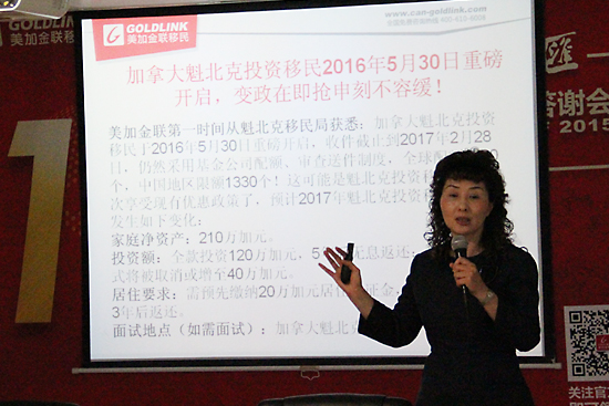 美加金联创办人Ms.Helen Zhou讲解加拿大魁北克企业家移民、加拿大魁北克投资移民、加拿大联邦创业投资移民新动态,以及美国投资移民、匈牙利投资移民、安提瓜与巴布达投资入籍项目优势、申请条件等等
