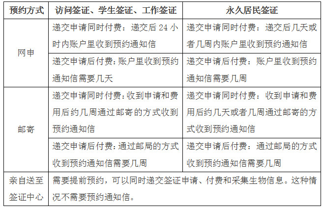 美加金联专家强烈建议您在递交申请的同时付费,这样24小时之内将会收到预约通知信;或者您亲自前往签证中心,把申请、付费和采集生物信息一起办完。