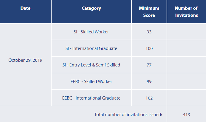 美加金联从加拿大BC省移民部获悉:2019年10月29日BC省移民部公布技术移民筛选分数:技术工人类别(SI-Skilled Worker)筛选分数93分,国际留学生类别(SI-International Graduate)筛选分数100分,中低技术工人类别(SI-Entry Level and Semi-Skilled)筛选分数77分,快速通道技术工人类别(EEBC-Skilled Worker)筛选分数99分,快速通道国际留学生类别(EEBC-International Graduate)筛选分数102分,本轮筛选共计发出413份邀请。与上一轮邀请人数相比增加136人。