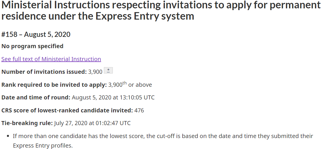 美加金联从加拿大移民部获悉:2020年8月5日加拿大联邦技术移民Express Entry快速通道项目筛选分数为476分,发出3,900份邀请。