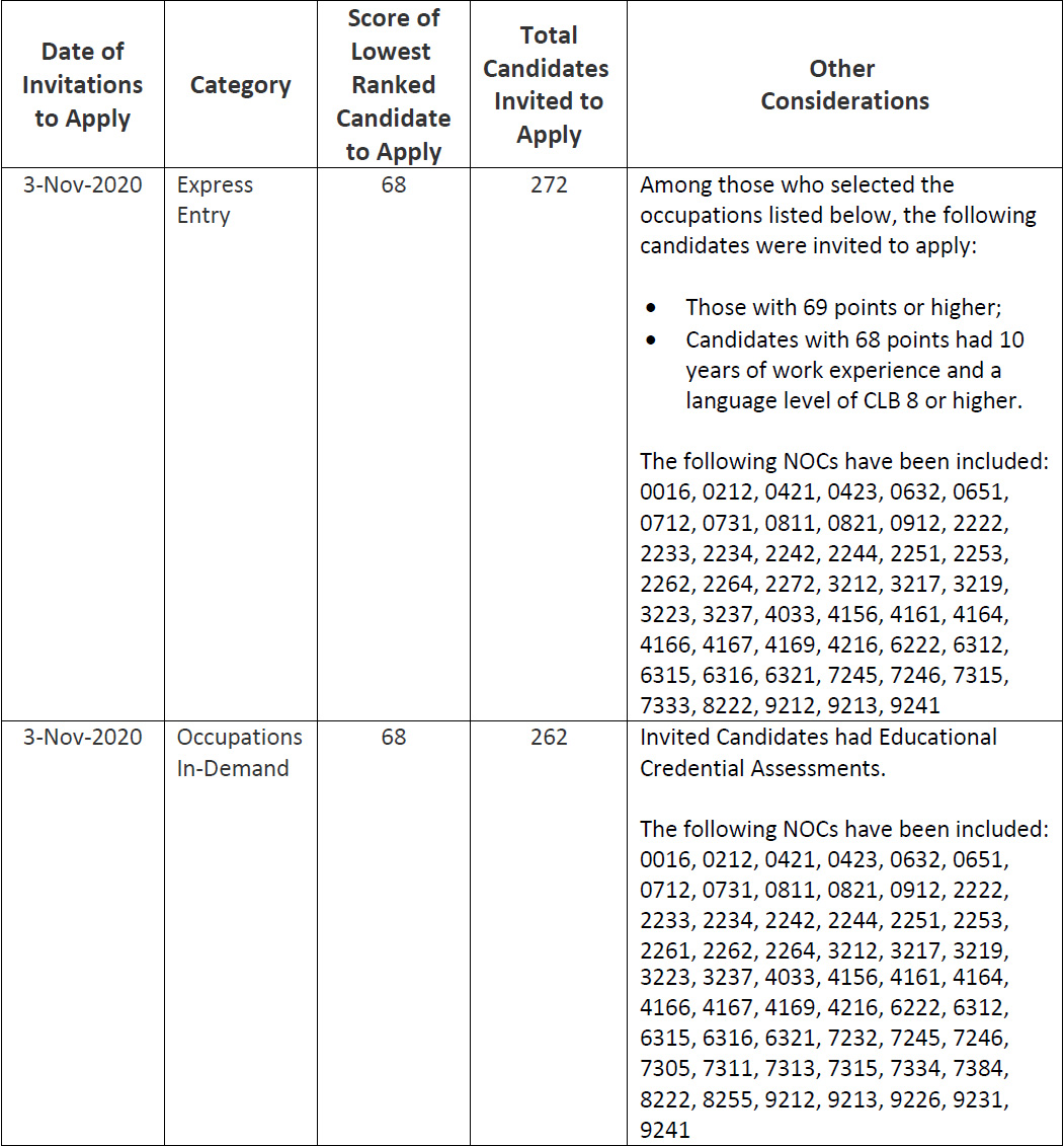 美加金联从加拿大萨省移民部获悉:2020年11月3日萨省技术移民快速通道(Express Entry,简称EE)类别筛选分数68分,发出272份邀请;需求职业(Occupation-in-Demand,简称OID)类别筛选分数68分,发出262份邀请。本轮筛选共计发出534份邀请。