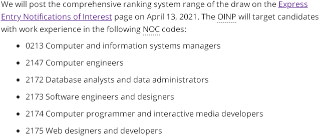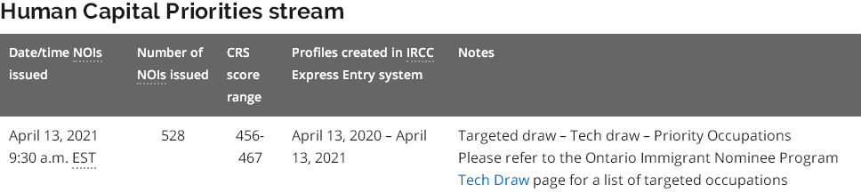 美加金联从加拿大安省移民部获悉:2021年4月13日,安省EE人力资源优先类移民项目(Human Capital Priorities Stream)发出528份意向通知(NOI),申请人EE综合评分(CRS)得分范围在456至467分之间。安省政府希望通过这种有针对性的筛选,来帮助更多安省的科技领域企业,更加轻松地招募到来自世界各地的专业技术人才。本次共邀请了六类职业。