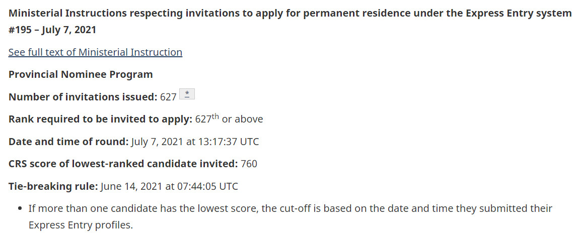 美加金联从加拿大移民部获悉:2021年7月7日加拿大联邦技术移民Express Entry快速通道项目筛选分数为:省提名760分,发出627份邀请。