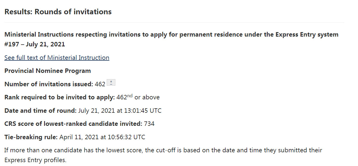 美加金联从加拿大移民部获悉:2021年7月21日加拿大联邦技术移民Express Entry快速通道项目筛选分数为:省提名734分,发出462份邀请。