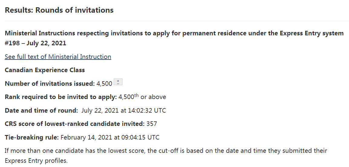 美加金联从加拿大移民部获悉:2021年7月22日加拿大联邦技术移民Express Entry快速通道项目筛选分数为:经验类357分,发出4,500份邀请。