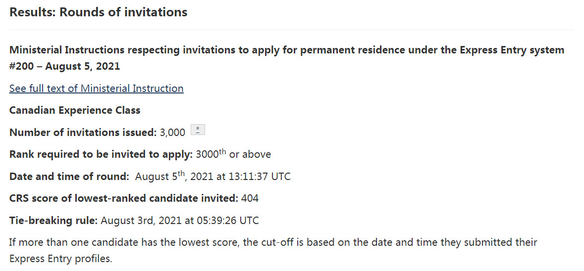 美加金联从加拿大移民部获悉:2021年8月5日加拿大联邦技术移民Express Entry快速通道项目筛选分数为:经验类404分,发出3,000份邀请。