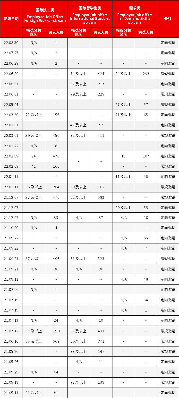 美加金联从加拿大安省移民局获悉:2022年08月30日,加拿大安省提名雇主担保类移民筛选分数出台: