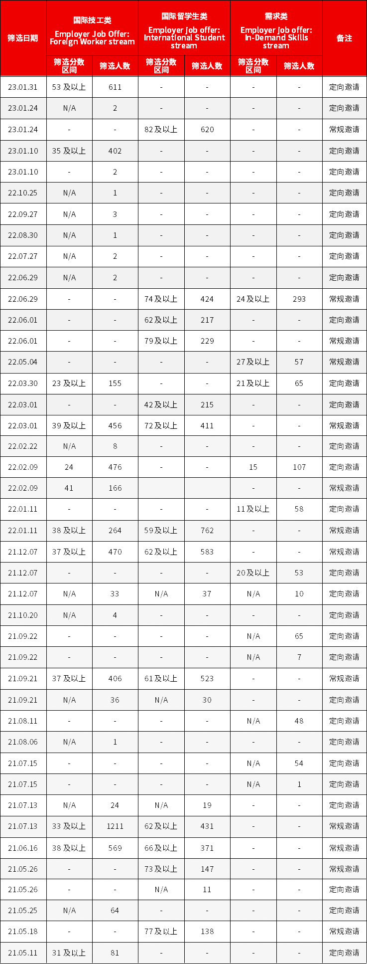 美加金联从加拿大安省移民局获悉:2023年01月31日加拿大安省省提名雇主担保 - 国际技工类(Employer Job Offer: Foreign Worker stream)移民筛选分数出台:定向邀请(Targeted draw):发出611份邀请,筛选分数53分及以上。