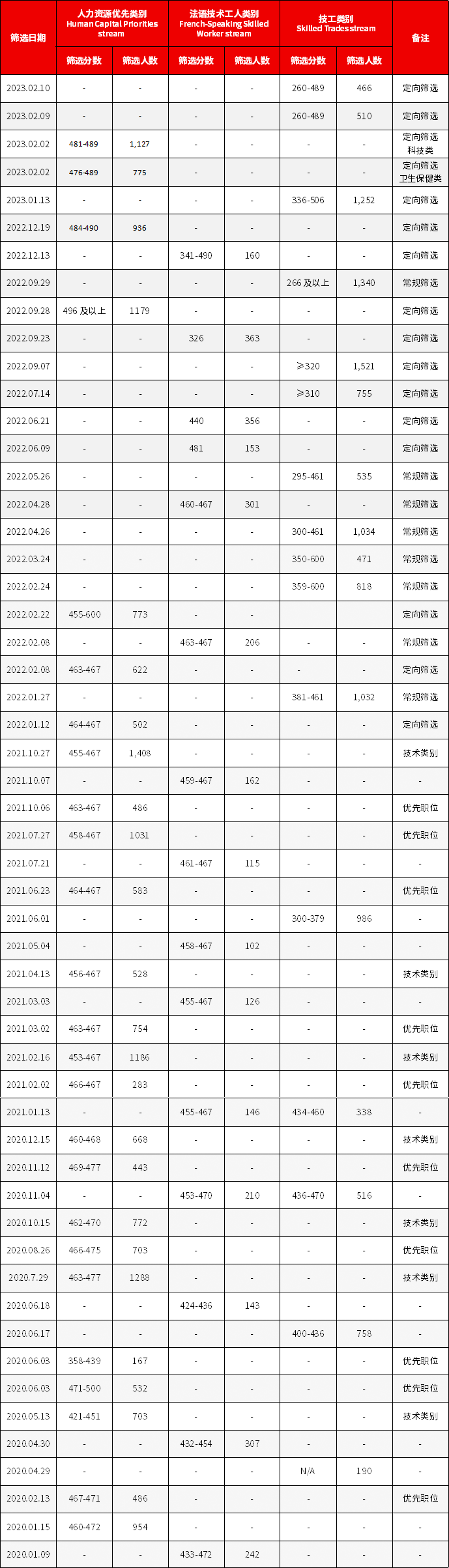 美加金联从加拿大安省移民局获悉:2023年02月10日,安省提名EE快速通道技工类移民(Skilled Trades stream)类别发出466份邀请,筛选通过分数(CRS)为260-489分。