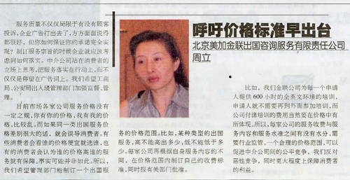 目前市场各家公司服务价格没有一定之规,你有你的价格,我有我的价格,比较乱。而如果同一类出国服务价格差别很大的话,就会误导消费者。有些消费者会看谁的价格便宜就选谁,也有的消费者会认为谁的价格高谁的服务就有保障。事实可能并非如此。所以,我们希望管理部门能制订一个出国服务的价格范围。比如,某种类型的出国服务,高不能高出多少,低不能低于多少。每家公司再根据自身服务内容的不同,在价格范围内制订自己的收费标准,同时报有关部门批准。 比如,我们美加金联公司为每一个申请人提供 600 小时的全英文环境的培训,申请人就不需要再到外面参加培训,而公司付诸培训的费用当然要在价格中有所体现。所以,每家公司的服务收费与服务内容和服务水准之间有没有水分,需要行业监管。一个合理的价格范围,可以促进中介公司间的公平竞争,我们反对恶性竞争,同时更大程度上保障消费者的利益。 |