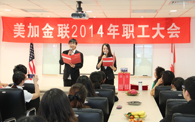 蛇奔前程去,马携好运来。值此辞旧迎新之际,美加金联2014年度职工大会于1月25日下午2:30拉开了帷幕,公司各高层领导、全体员工汇聚于美加金联会议厅,满怀着喜悦的心情,共同迎接新年的到来。