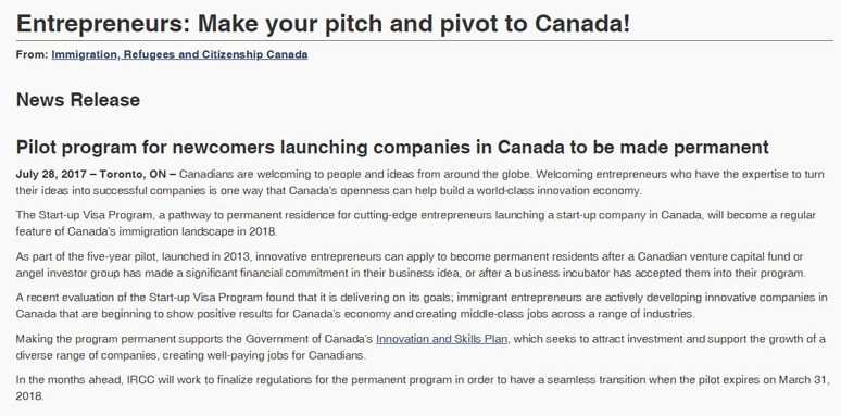 加拿大移民部(IRCC)官网于2018年3月31日发布的最新消息:加拿大联邦创业投资移民已成为永久性项目。