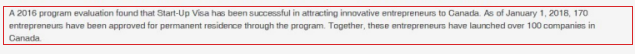 截至2018年1月1日,已有 170名企业家通过该项目获得加拿大永久居留权。这些企业家总共在加拿大创立了100多家公司。