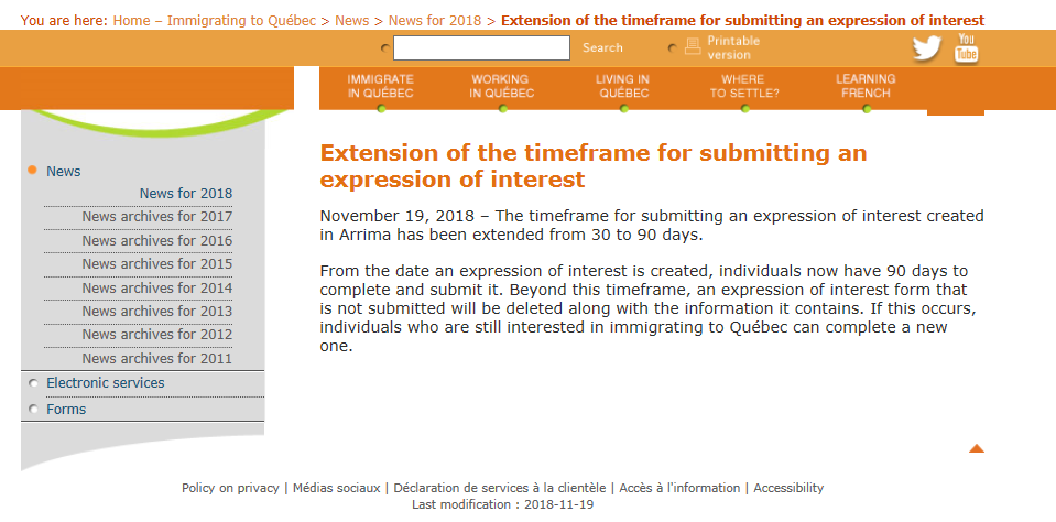 美加金联2018年11月19日从魁北克移民局官网获悉:魁北克技术移民申请人在Arrima系统创建账户,填写完整信息,递交申请的期限由原来的30天延长为90天。如果申请人超过90天未递交申请,系统将删除申请人的申请。申请人再次申请时,需要重新注册Arrima账户,并在规定的90天期限内递交申请。