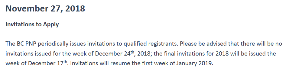 美加金联从加拿大BC省移民局获悉:BC省移民局将从2018年12月24日暂停所有BC省省提名项目EOI筛选,2019年1月2日恢复。