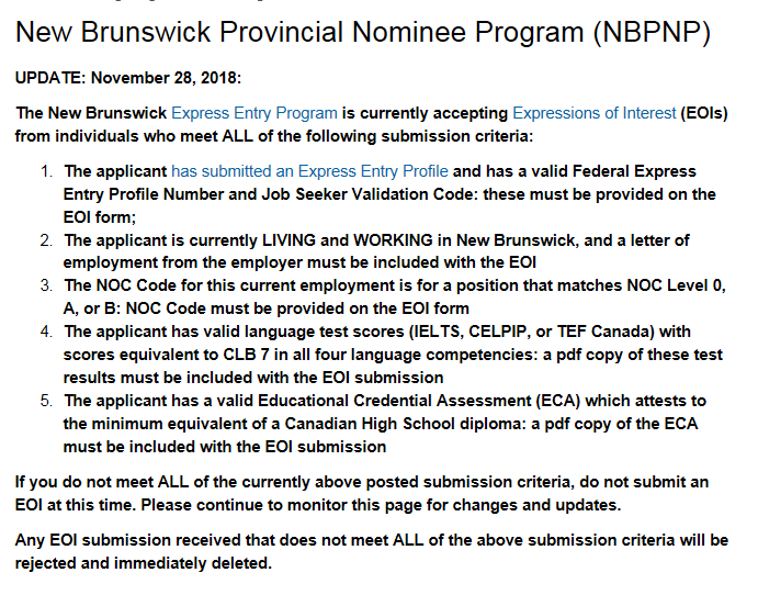 美加金联从加拿大新不伦瑞克省(NB省)移民局获悉:2018年11月28日NB省Express Entry快速通道移民项目开始接收EOI申请。申请人需满足以下条件才能递交EOI申请: