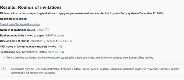 美加金联从加拿大移民部获悉:2018年12月12日加拿大联邦Express Entry快速通道移民项目第106轮筛选分数为445分,与上轮分数相同。本轮筛选发出3,900份邀请,与上轮人数相同。