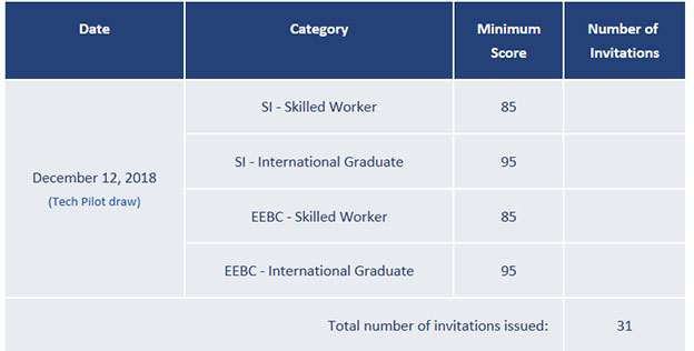 美加金联从加拿大BC省移民局获悉:2018年12月12日BC省省提名科技人才试验项目(Tech Pilot)类别的技术工人类别(SI-Skilled Worker)筛选分数85分;国际留学生类别(SI-International Graduate)筛选分数95分;快速通道技术工人类别(EEBC-Skilled Worker)筛选分数85分;快速通道国际留学生类别(EEBC-International Graduate)筛选分数95分,本轮筛选共计发出31份邀请。