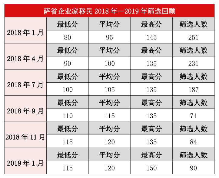 2019年1月3日萨省企业家移民进行的第1次EOI筛选,最低分115分,虽然与2018年11月21日EOI筛选最低分相同,但是与2018年1月EOI筛选最低分80分相比,分数提高了35分。可以看出,萨省企业家移民EOI筛选的分数一直在逐渐增高,对于有意办理萨省企业家移民的申请人来说,务必要抓紧时间尽早递交EOI筛选,争取在相对低分的情况下获得名额。