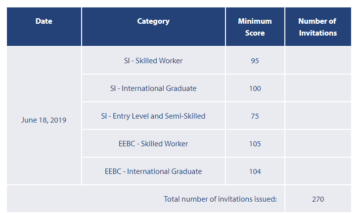 美加金联从加拿大BC省移民部获悉:2019年6月18日BC省移民部公布技术移民筛选分数:技术工人类别(SI-Skilled Worker)筛选分数95分,国际留学生类别(SI-International Graduate)筛选分数100分,中低技术工人类别(SI-Entry Level and Semi-Skilled)筛选分数75分,快速通道技术工人类别(EEBC-Skilled Worker)筛选分数105分,快速通道国际留学生类别(EEBC-International Graduate)筛选分数104分,本轮筛选共计发出270份邀请。与上一轮邀请人数相比减少4人。