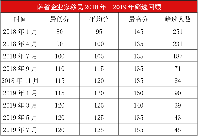 美加金联从加拿大萨省移民部获悉:2019年7月4日萨省企业家移民EOI筛选分数最低120分,最高155分,平均125分,本轮筛选共计发出45份邀请。