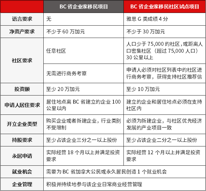 BC省企业家移民社区试点项目与BC省企业家移民对比: