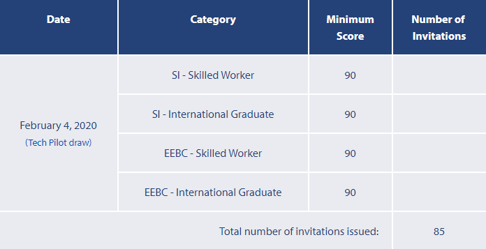 美加金联从加拿大BC省移民部获悉:2020年2月4日BC省移民部公布技术移民筛选分数:技术工人类别(SI-Skilled Worker)筛选分数90分,国际留学生类别(SI-International Graduate)筛选分数90分,快速通道技术工人类别(EEBC-Skilled Worker)筛选分数90分,快速通道国际留学生类别(EEBC-International Graduate)筛选分数90分,本轮筛选共计发出85份邀请。