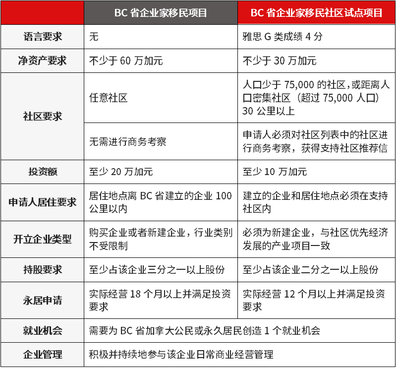 BC省企业家移民社区试点项目与BC省企业家移民对比: