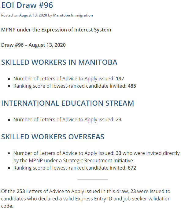 美加金联从曼省移民部获悉:2020年8月13日,曼省省内技术工人筛选分数485分,发出197份邀请。海外技术工人通过战略招聘计划邀请的筛选分数672分,发出33份邀请。国际留学生类别发出23份邀请。本轮总计邀请253人。