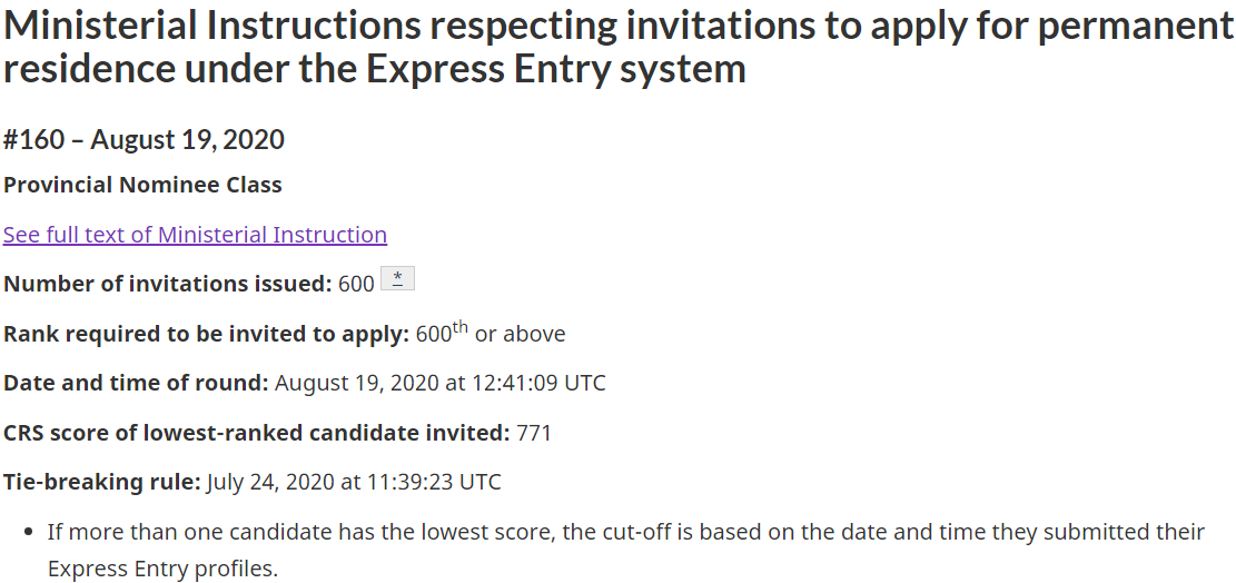 美加金联从加拿大移民部获悉:2020年8月19日加拿大联邦技术移民Express Entry快速通道项目筛选分数为:省提名类771分,发出600份邀请。