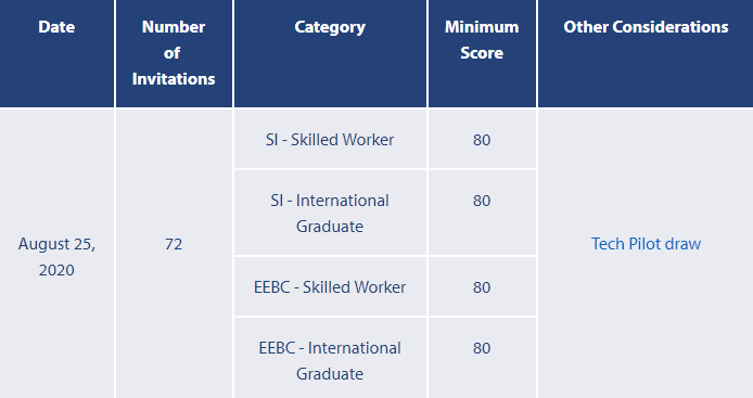 美加金联从加拿大BC省移民部获悉:2020年8月25日BC省移民部公布技术移民筛选分数:技术工人类别(SI-Skilled Worker)筛选分数80分,国际留学生类别(SI-International Graduate)筛选分数80分,快速通道技术工人类别(EEBC-Skilled Worker)筛选分数80分,快速通道国际留学生类别(EEBC-International Graduate)筛选分数80分,本轮筛选共计发出72份邀请。