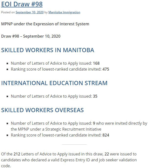 美加金联从曼省移民部获悉:2020年9月10日,曼省省内技术工人筛选分数475分,发出168份邀请。海外技术工人通过战略招聘计划邀请的筛选分数824分,发出9份邀请。国际留学生类别发出35份邀请。本轮总计邀请212人。
