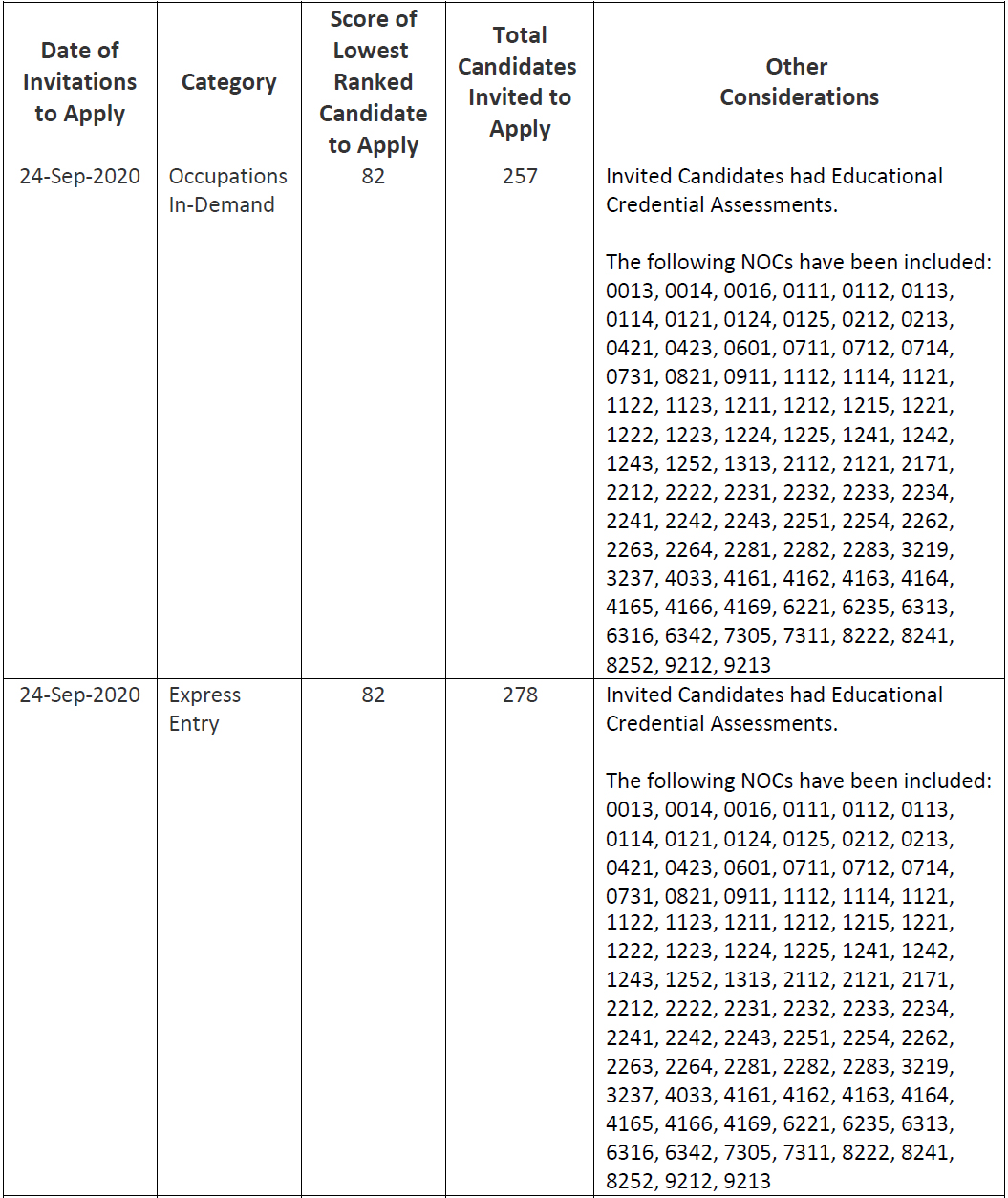 美加金联从加拿大萨省移民部获悉:2020年9月24日萨省技术移民快速通道(Express Entry,简称EE)类别筛选分数82分,发出278份邀请;需求职业(Occupation-in-Demand,简称OID)类别筛选分数82分,发出257份邀请。本轮筛选共计发出535份邀请。