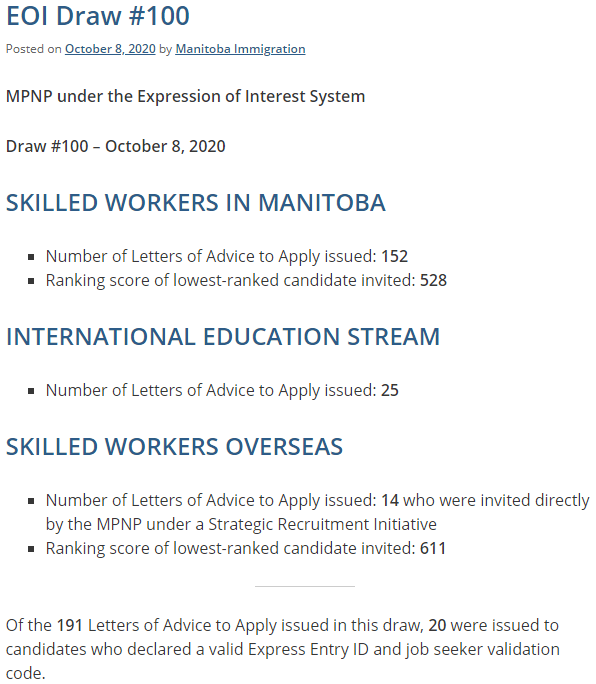 美加金联从曼省移民部获悉:2020年10月8日,曼省省内技术工人筛选分数528分,发出152份邀请。海外技术工人通过战略招聘计划邀请的筛选分数611分,发出14份邀请。国际留学生类别发出25份邀请。本轮总计邀请191人。
