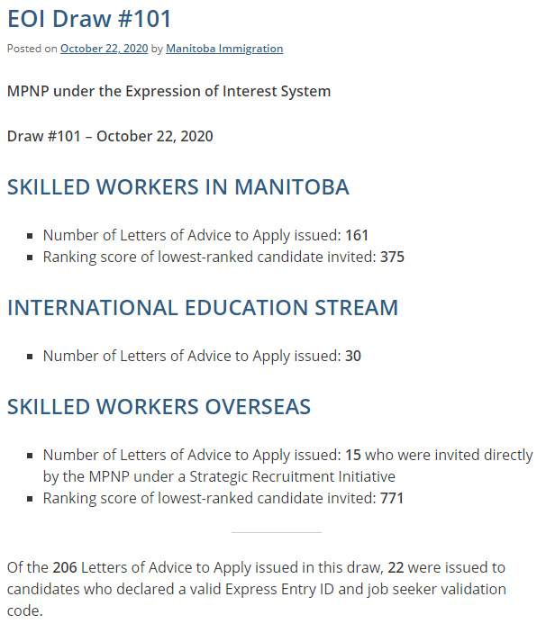美加金联从曼省移民部获悉:2020年10月22日,曼省省内技术工人筛选分数375分,发出161份邀请。海外技术工人通过战略招聘计划邀请的筛选分数771分,发出15份邀请。国际留学生类别发出30份邀请。本轮总计邀请206人。
