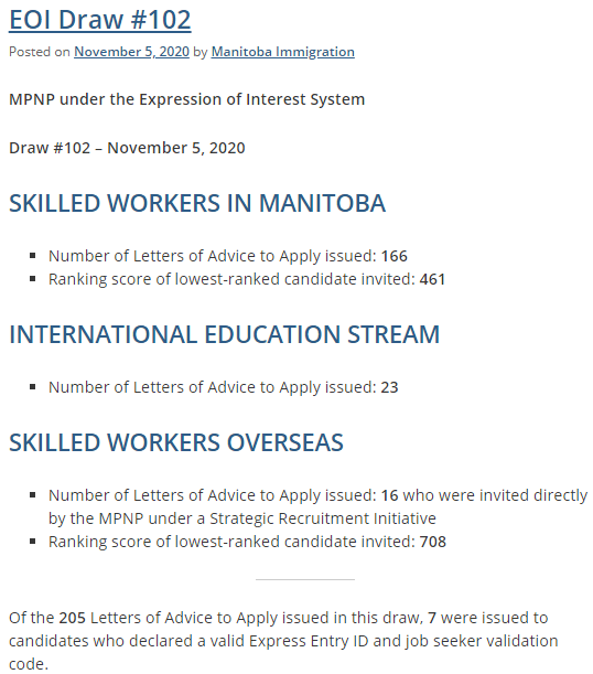 美加金联从曼省移民部获悉:2020年11月5日,曼省省内技术工人筛选分数461分,发出166份邀请。海外技术工人通过战略招聘计划邀请的筛选分数708分,发出16份邀请。国际留学生类别发出23份邀请。本轮总计邀请205人。